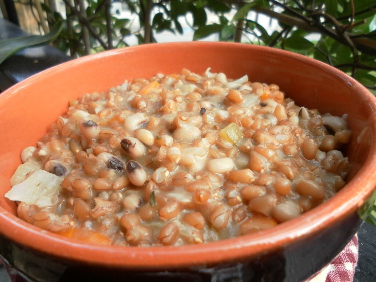 INGREDIENTI: farro decorticato, fagioli all’occhio (diffusi in Occidente medievale), lardo, olio, sedano, carota, cipolla, aglio, salvia e sale.