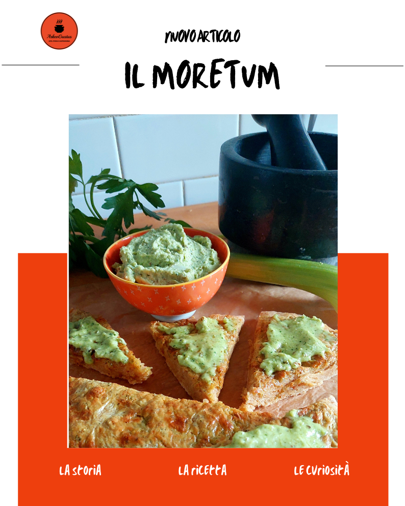 Nello specifico egli utilizza del frumento, circa 16 libbre e lo macina ma la farina utilizzata è farina bianca di grano. Nel testo infatti il contadino, dopo avere macinato il grano, lo passa al setaccio per rimuovere la crusca e aggiunge dell’acqua fino a comporre questo impasto morbido da far riposare. Intanto come condimento elabora una crema a base di cacio ed erbe aromatiche fresche come l’aglio, sedano e ruta. La ricetta di Columella per il moretum include santoreggia, menta, rucola, lattuga, timo, nepitella e puleggio. L’autore non specifica il tipo di formaggio usato, soltanto che è stagionato. Potete scegliere formaggio di pecora, capra o vacca. L’aglio è preponderante, infatti utilizza ben 4 teste ma noi dimezziamo le dosi.